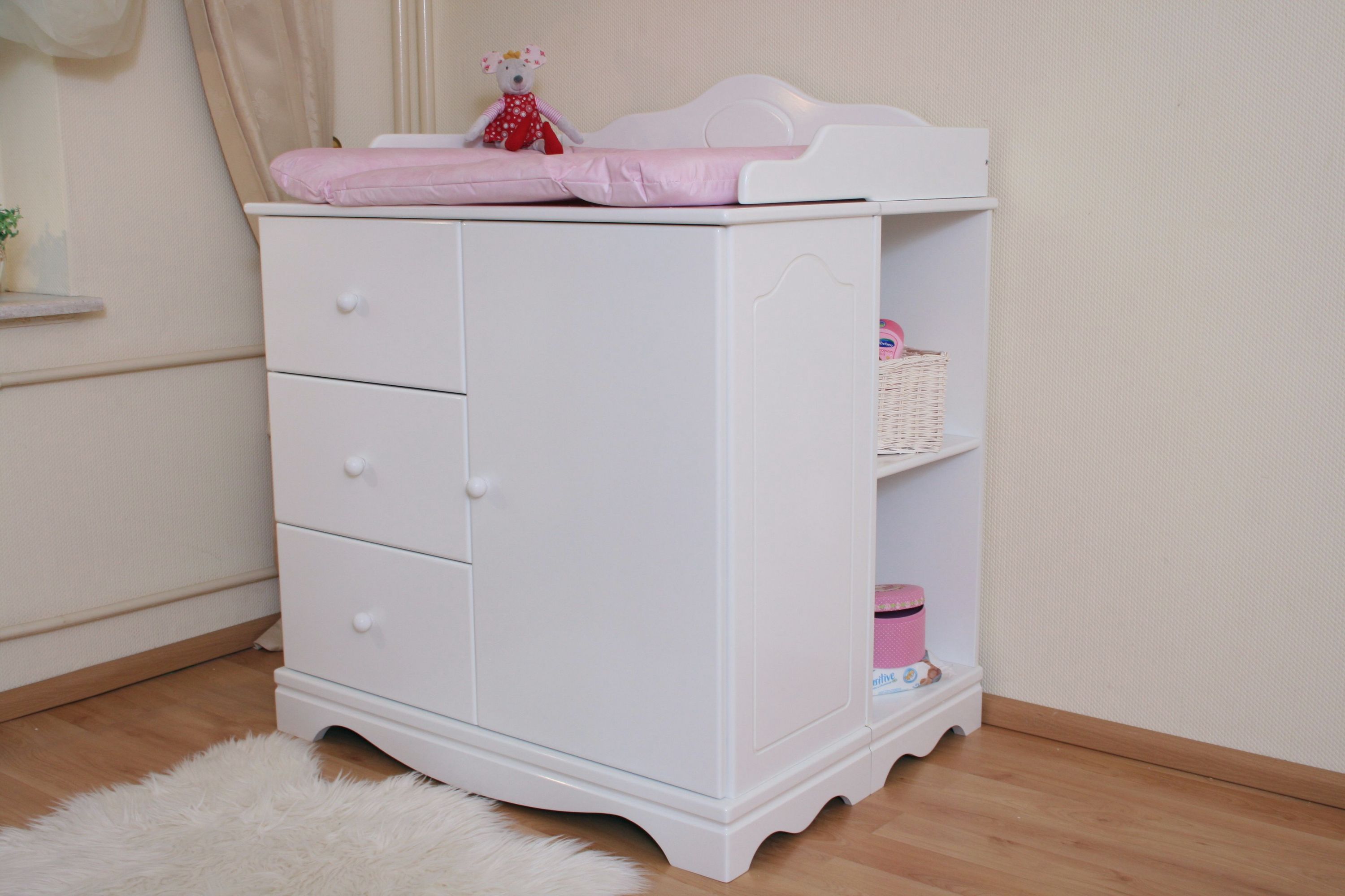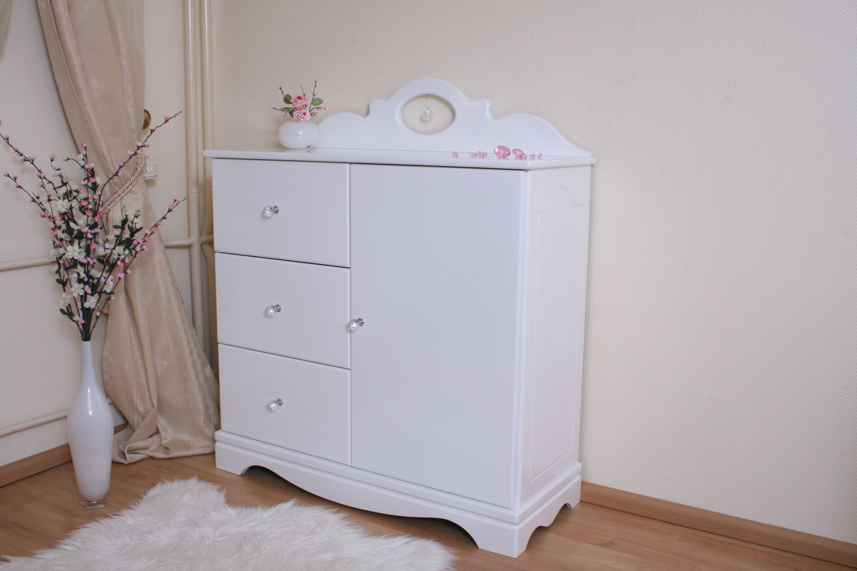 Zeitlose und stabile Wickelkommode von Oli&Niki in weiß aus der Möbelserie Laura in einem einzigartigen Design, die durch ihren originellen Aufsatz und dekorative Fräsungen besticht. Der Aufsatz kann auf Wunsch mit einer ovalen Aussparung und einer 3 cm großen Kristallkugel ausgestattet werden, die bei Sonnenlicht funkelnde Leuchteffekte in allen Regenbogenfarben spendet. Die Kinderkommode verfügt über drei Schubladen, die viel Stauraum für Kleidung und Spielsachen bieten. Auf der rechten Seite, hinter einer Tür befinden sich 3 praktische Ablagefächer. Die Kommode ist mit transparenten, in Facetten geschliffenen Griffen ausgestattet. Zur Auswahl stehen Ihnen Möbelgriffe aus Acrylglas oder Griffe mit echten Swarovski-Kristallen. Durch das Abnehmen vom hinteren Kasten und zwei Seitenschutzelementen lässt sich die Wickelkommode in eine zeitlose XL Kommode umwandeln. Die Kommode wird aus hochwertigem Mdf-Material handgefertigt und deckend lackiert. Das Material ist form- und farbbeständig.