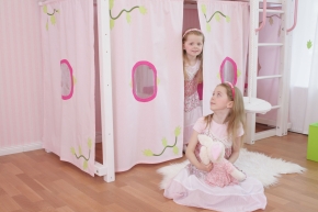 Romantisches Hochbett für Mädchen in einer hervorragenden Qualität und einzigartigem Design von Oli&Niki. Die sehr stabile Holzkonstruktion wurde weiß und deckend lackiert und mit beschichteten MDF-Platten kombiniert. Auffallend dekorativ sind die Fenster in einer ovalen Form, die mit pinker Umrandung, rosa Krönchen und grünen Ornamenten dekoriert wurden. Durch die verspielten, geschwungenen Linien und die aufgeklebten Halbkugeln in pink wirken die Seiten- und Frontteile fast wie eine Krone. Das tolle Hochbett für Mädchen besitzt im unteren Bereich ein kleines Sofa. Die kleinen Prinzessinen müssen nicht immer ganz nach oben klettern, um sich hinzusetzen, wenn sie eine kurze Spielpause brauchen. Das Sofa ist mit einem praktischen Kasten ausgestattet, in dem man viele Accessoires verstauen kann. Der Kasten lässt sich bequem auf Rollen herausziehen. Dank der Schaukel sind viele Abenteuer über den Wolken möglich. Die rosa Vorhänge sind mit Blättergirlanden und transparenten, ovalen Fenstern dekoriert. Dieses, in seiner Form- und Farbgestaltung, elegante Hochbett für Mädchen garantiert nicht nur schöne Träume sondern auch viele Stunden voller Spielspaß.