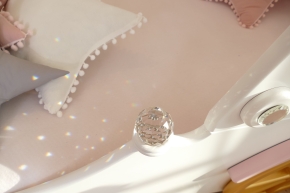 Das neue, außergewöhnliche Bett von Oli&Niki in Form einer märchenhaften Kutsche ist in drei wunderschönen Farbtönen gehalten: weiß, rosa und gold. Das Gestell der Kutsche wird mit aufwändig gefrästen, rosarfarbenen Verzierungen und funkelnden Kristallen dekoriert. Das Verdeck der Kutsche enthält einen dekorativen Aufsatz mit einer rosa Krone, die mit Glitter verschönert und mit echten Kristallkugeln veredelt ist. Seitlich ist das Verdeck mit drei Öffnungen ausgestattet, die dem Kutschenbett noch mehr Eleganz und Leichtigkeit verleihen. Von oben ist das Verdeck mit einem wunderschönen, leichten Stoff verschlossen. Der Stoff ist zweilagig und besteht aus weißem Tüll und einem pastellfarbenen, weichen Satin. Der Stoff kann in 2 Farben bestell werden: schneeweiß oder zartrosa. Die Kutsche steht auf massiven, goldenen Rädern, die mit hübsch geformten Radläufen umfasst sind. Auf beiden Seiten vom Gestell befinden sich zwei 5 cm große Kristallkugeln, die bei sonnigem Wetter wunderschöne Lichteffekte im Kinderzimmer projizieren. Dieses einzigartige Kinderbett wird zum Highlight in jedem Mädchenzimmer.