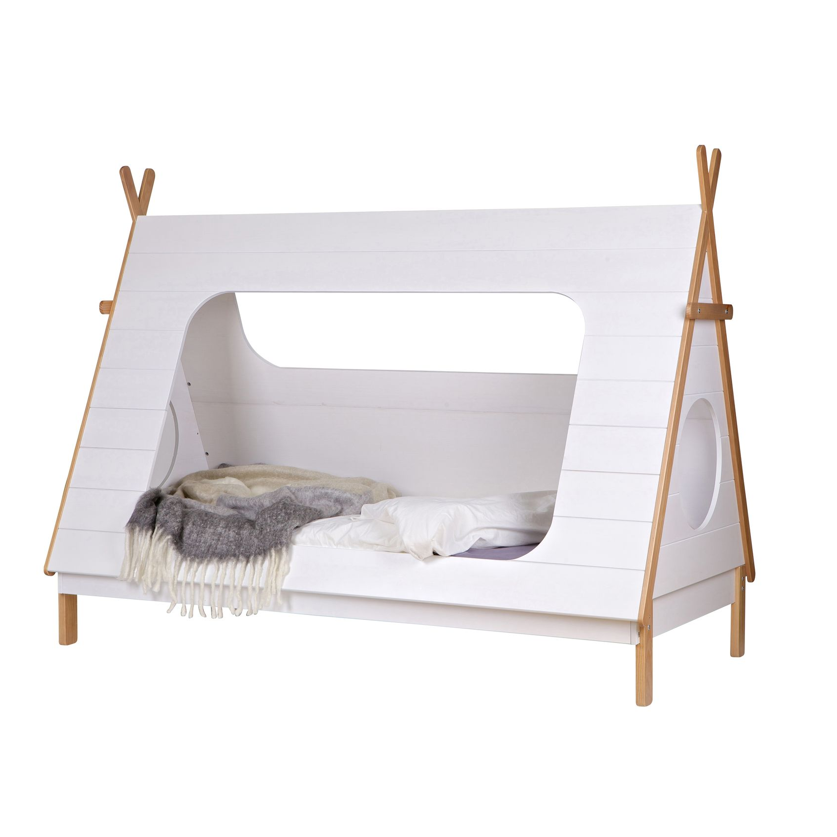 Massives und robustes Woood Kinderbett Tipi für Matratzengröße 90x200cm in weiß-natur, das nicht nur für kleine Indianer ein Traum ist. Das Tipibett wird aus massiven Naturholz hergestellt. Die Oberfläche weist sichtbare Äste und Maserung auf und verleiht dem Bett einen natürlichen Look. Das Bett bieten ihren Kindern den perfekten und individuellen Rückzugsort. Es ermöglicht unzählige Möglichkeiten für kreative Dekorationen. Das Hausbett kann zum Beispiel mit Girlanden, Lichterketten oder Kissen in allen Farben geschmückt werden - je nach Geschmack, Lust und Laune. Ihrer Kreativität werden keine Grenzen gesetzt. Das Woood Kinderbett Tipi wirkt wie ein Zelt und schafft damit eine gemütliche Zeltlager-Atmosphäre im Kinderzimmer, wo die Kinder ausgelassen Spielen, Toben oder sich Entspannen können. Das Bett kann optional mit einer praktischen Schubladen ausgestattet werden.Das Tipi-Bett eignet sich ganz besonders für Kinderzimmer mit Dachschräge. Der Aufbau kann jederzeit abgebaut werden.
