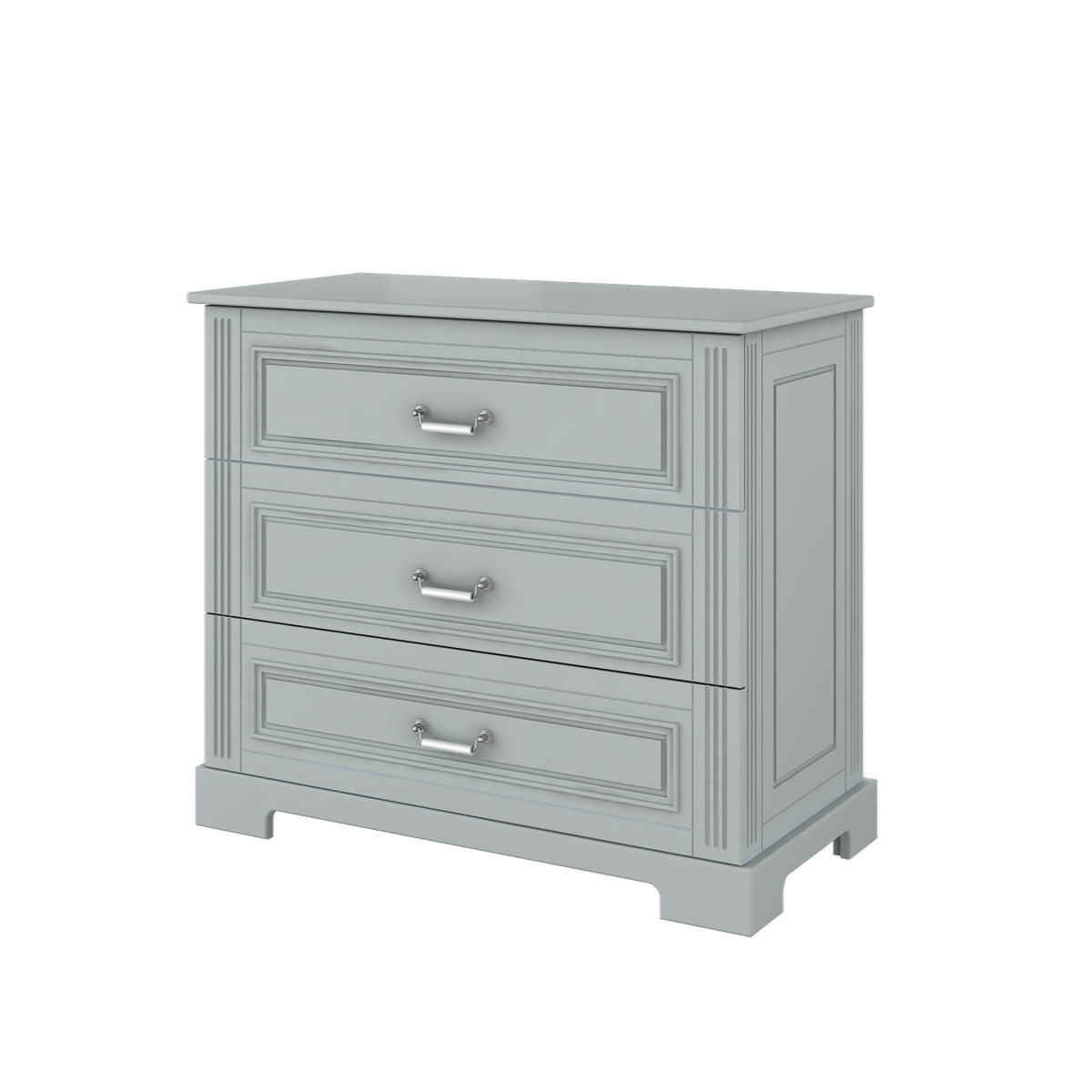 Massive und hochwertige Kommode aus der wunderschönen Serie Ines in grau mit 3 Schubladen, die durch ihre klassische und nostalgische Optik besticht. Die wunderschönen Leisten und die profilierten Kanten verleihen dieser Serie viel Charme und Gemütlichkeit. Die Kinderkommode verfügt über drei Schubladen, die viel Stauraum für Kleidung und Spielsachen bieten.Die praktischen Schubladen sind mit Blum-Schubladenführungen mit Soft-Close-System ausgestattet. Die Kommode wird aus hochwertigem Mdf-Material gefertigt und weiß lackiert. Das Material ist form- und farbbeständig. Die Kommode kann optional mit Hilfe von einem Aufsatz zu einer Wickelkommode umgebaut werden.