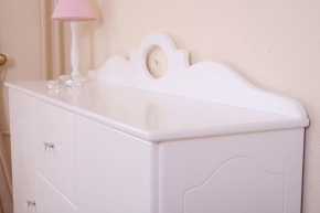 Sehr massive und elegante Kommode von Oli&Niki in der XXXL Variante in weiß aus der Kristallserie 1 in einem traumhaft schönen Design, die durch ihren geschwungenen Aufsatz und dekorative Fräsung an den Seiten besticht. In der ovalen Aussparung des Aufsatzes befindet sich eine Kristallkugel, die bei Sonnenlicht funkelnde Leuchteffekte in allen Regenbogenfarben spendet. Die Kinderkommode verfügt über drei Schubladen und 2 Türen, die viel Stauraum für Kleidung und Spielsachen bieten. Im Inneren der Kommode findet sich eine zweckmäßige Ausstattung bestehend aus 2 Regalböden auf jeder Seite. Die Kinderkommode ist mit transparenten, in Facetten geschliffenen Griffen ausgestattet. Zur Auswahl stehen Ihnen Möbelgriffe aus Acrylglas oder Griffe mit echten Swarovski-Kristallen. Die Kommode wird aus hochwertigem Mdf-Material handgefertigt und deckend lackiert. Das Material ist form- und farbbeständig.