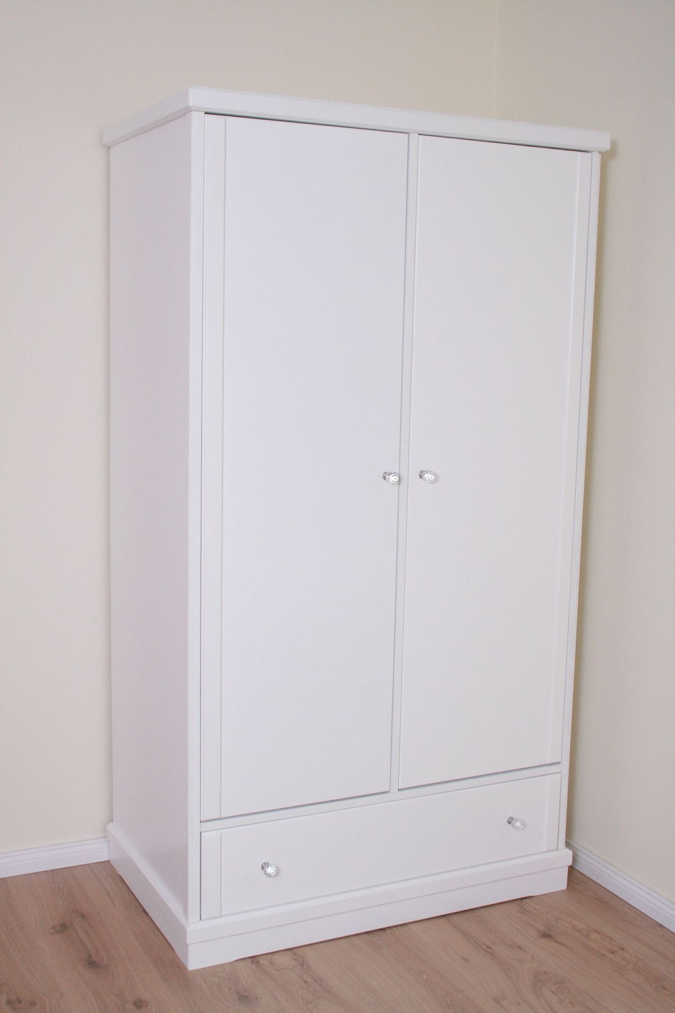 Schlichter und moderner Kleiderschrank in weiß aus der Kristallserie 4 von Oli&Niki in einer sehr hohen Qualität, der durch seine klare und edle Optik besticht. Als Highlight wurde der Kleiderschrank mit besonderen, transparenten Griffen versehen. Zur Auswahl stehen hier Möbelgriffe aus Acrylglas oder Griffe mit echten Swarovski-Kristallen. Hinter den zwei Schranktüren findet sich eine zweckmäßige Ausstattung bestehend aus 3 Regalböden auf der linken und einem Regalboden sowie einer Kleiderstange darunter auf der rechten Seite. Für mehr Stauraum sorgt eine praktische, große Schublade, die reichlich Stauraum bietet. Optional ist der Schrank auch als 3-Türer erhältlich. Der Kleiderschrank wird aus hochwertigem Mdf-Material und Möbelplatten im Innenraum hergestellt sowie weiß lackiert. Das Material ist form- und farbbeständig.